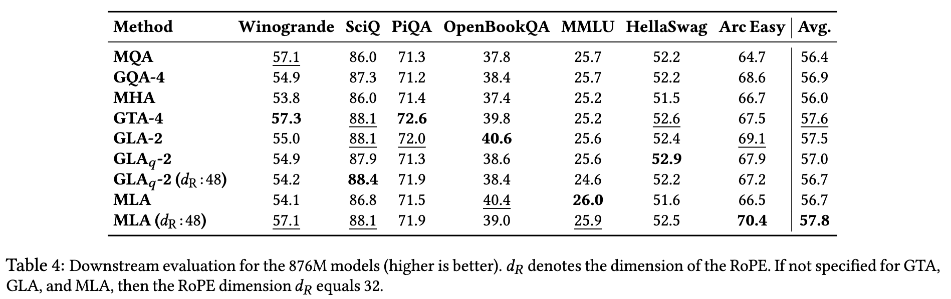 - 超大模型(1.471B):GLA-2 达 60.0%,高于 MLA(59.1%);GTA-4 与 GQA-4 均为 60.2%(表 5)