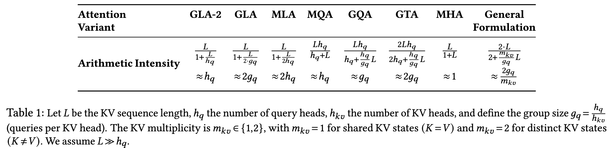 GQA 通过在每个 KV 头下共享多个 query 头,使得操作次数不变但内存访问减少,从而算术强度提升(比例为分组大小 g q = h q / h k v g_q = h_q / h_{kv} gq=hq/hkv)。