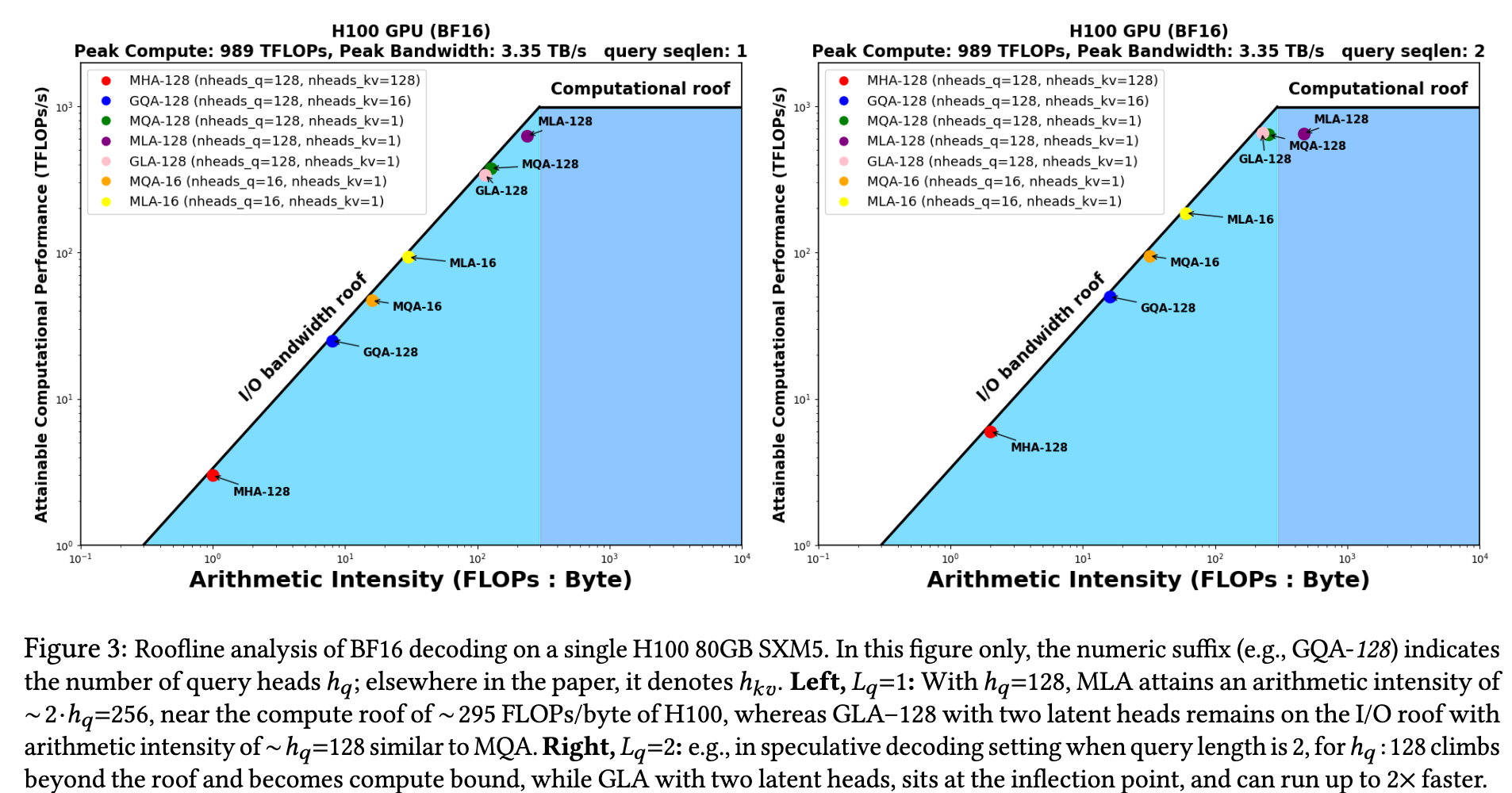 实现了远高于 MQA 的算术强度。其 latent 表示不会 materialize 出具体 K/V,而是直接用于 attention 计算。