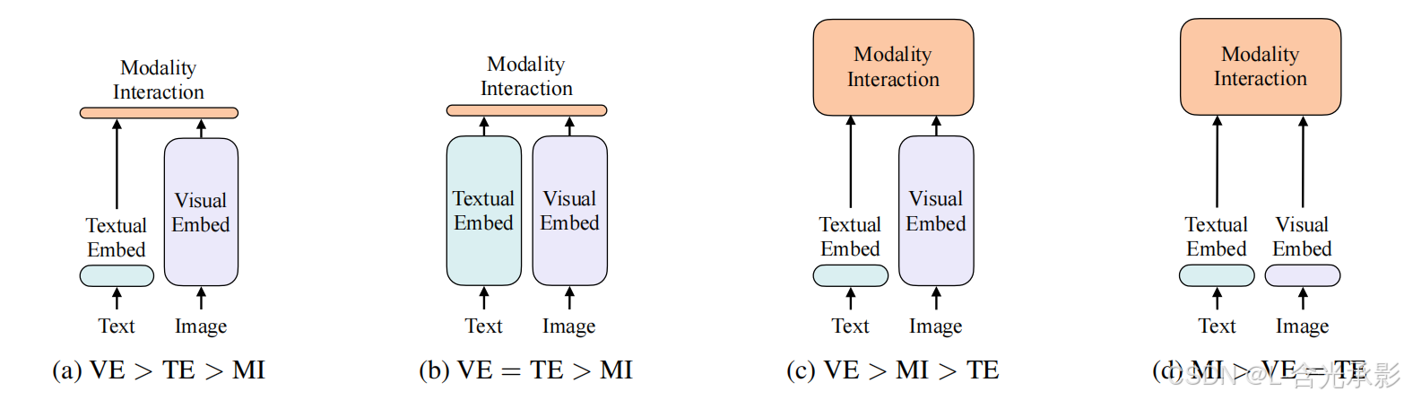 作者总结了视觉-语言模型(Vision-and-Language Models)的 四种计算范式分类,通过比较视觉嵌入(VE)、文本嵌入(TE)和模态交互(MI) 三个模块的相对计算量(矩形高度表示),展示不同模型的设计差异。