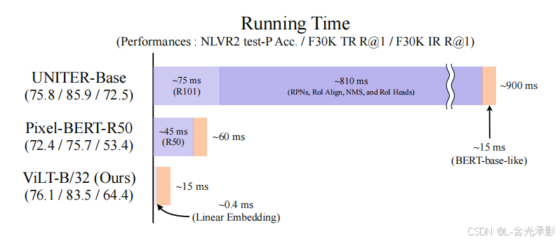 视觉嵌入极简(线性投影,VE耗时低),文本用标准BERT(TE),模态交互(MI)成为主要计算部分。ViLT 就是属于此种模型。