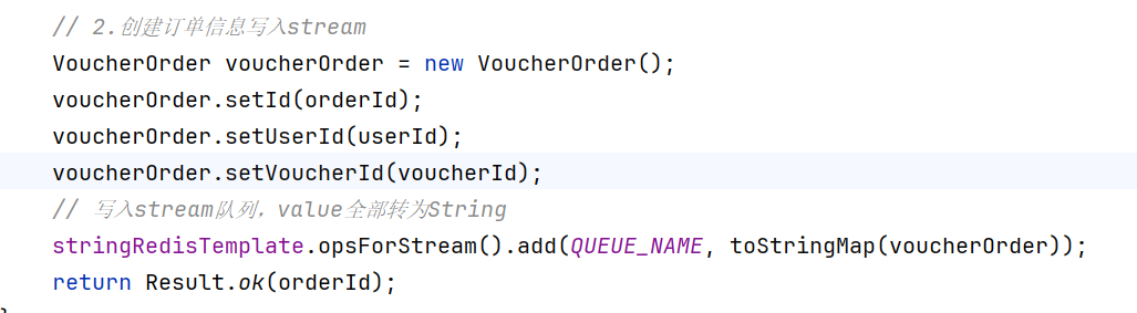 -- redis.call('xadd', 'stream.orders', '*', 'userId', userId, 'voucherId', voucherId, 'id', orderId)