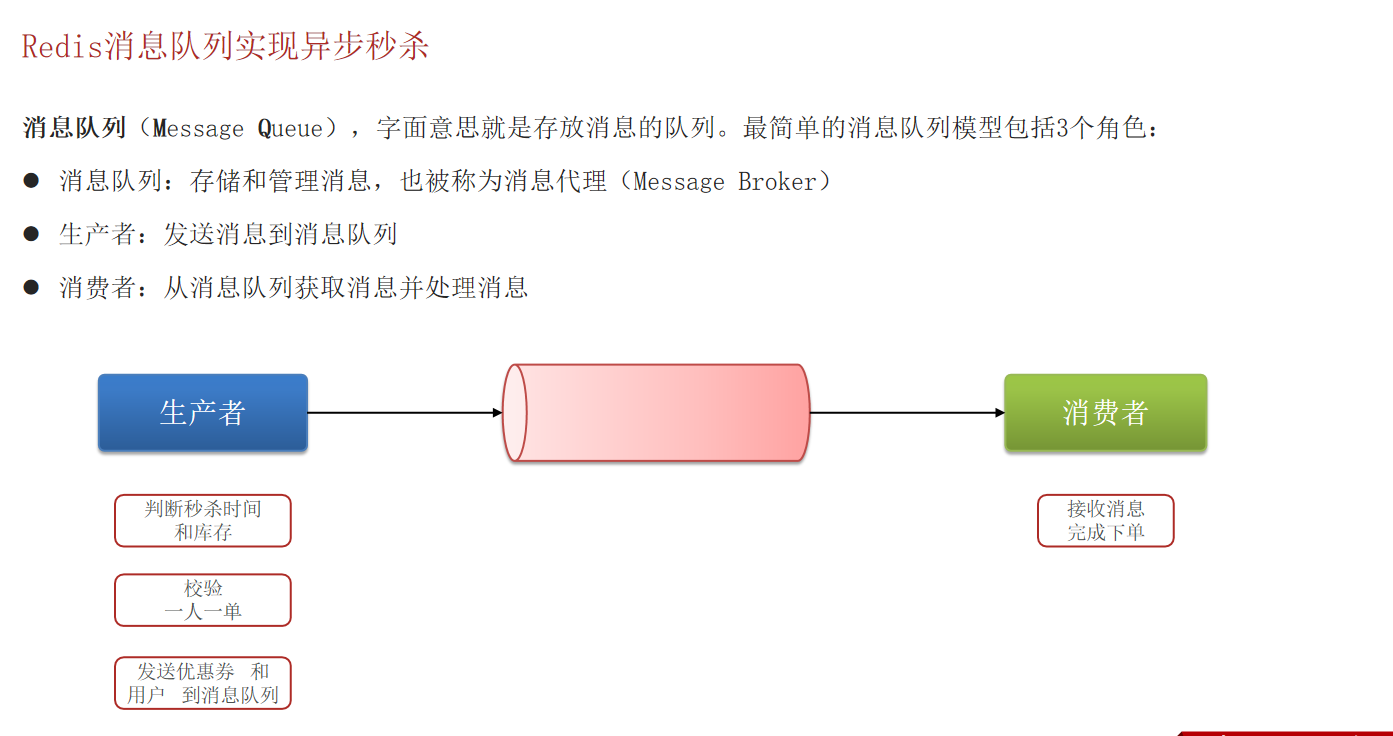 我们可以将比较耗时的逻辑判断放入redis中,比如库存是否充足,是否是一人一单,这样的逻辑如果能通过,就表示一定是能下单的,那么我就不需要等真实的下单逻辑走完,可以直接返回给用户结果,真实的下单流程我们可以在后台开个线程,让后台的线程去执行下单程序。