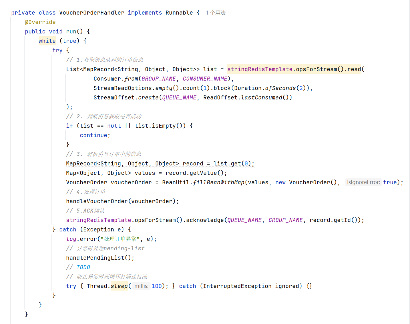 - 项目启动时,开启一个线程任务,尝试获取stream.orders中的消息,完成下单