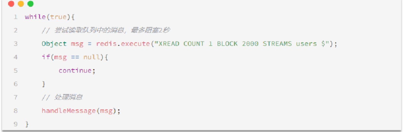 // 1.获取消息队列中的订单信息 XREADGROUP GROUP g1 c1 COUNT 1 BLOCK 2000 STREAMS s1 >