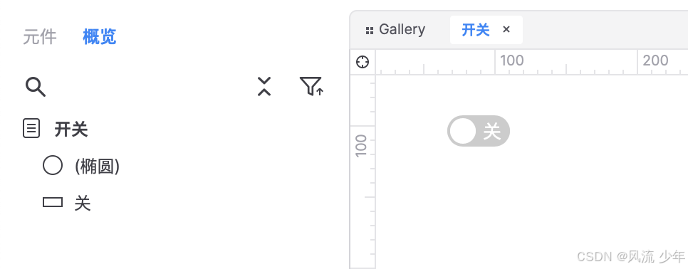 一:制作关状态 拖入一个矩形作为关闭的底色:44 x 22,填充灰色CCCCCC,圆角23,边框宽度0,文本为”关“,右对齐,边距2,2,6,2,文本颜色白色FFFFFF。 拖拽一个椭圆,尺寸18 x 18,边框为0。 3. 全选转为动态面板状态1命名为”关“。 二:制作开状态 复制关状态并命名为”开“。 修改文本关改为”开“,文本左对齐,填充颜