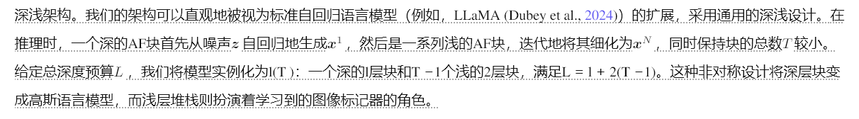 3.1 中的推导促使我们重新设计在实际计算预算内的可扩展 AF 架构,强调我们不需要大幅扩展流块的数量——实际上(即使 T = 2 通常也足够了)。然而,该评论并未解决如何最好地在这些块之间分配计算资源的问题。我们首先检查 TARFlow 中提出的架构配置,该配置建议为每个流分配相同大小的 Transformer 层。有趣的是,在我们复现的 TARFlow 结果中,我们发现最有效的计算(通过指导的视角衡量)集中在最上面的几个 AF 块中(参见示例图 3)。我们推测端到端训练驱动网络去利用 lay