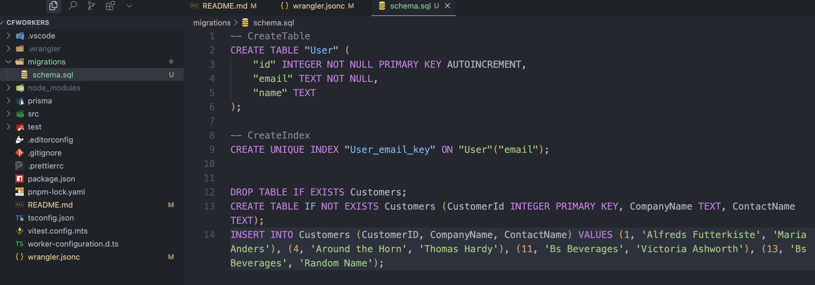 npx wrangler d1 execute prod-d1-tutorial --local --command="SELECT * FROM Customers"