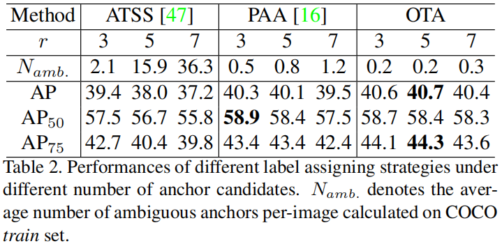 当发生遮挡或者多个对象靠的非常近时,一个anchor可能是多个ground truth的合格候选对象(比如Faster RCNN中一个anchor与多个gt的IoU都大于0.5),这种anchor定义为ambiguous anchor。之前的方法主要通过人工设定的规则来处理这种情况,比如Min Area、Max IoU、Min Loss等。本文将 \(max\ \pi^{*}_{j}<0.9\) 的anchor \(a_{j}\) 定义为ambiguous anchor,然后统计在不同的 \(r\) 值下ATSS、PAA、OTA的ambiguous anchor的数量以及对应的精度。从上表(2)中可以看出,随着 \(r\) 的增大,ATSS中ambiguous anchor的数量显著增加,AP也降了1.8个点。PAA中ambiguous anchor的数量对 \(r\) 的变化不那么敏感,但AP也降了0.8个点。而OTA中ambiguous anchor的数量既对 \(r\) 的变化不敏感,和ATSS、PAA相比数量也是最少的,同时AP也只下降了0.3个点。这是因为当多个gt试图将positive label传输到同一个anchor时,OT算法会基于全局最小传输成本的准则自动解决它们之间的冲突。