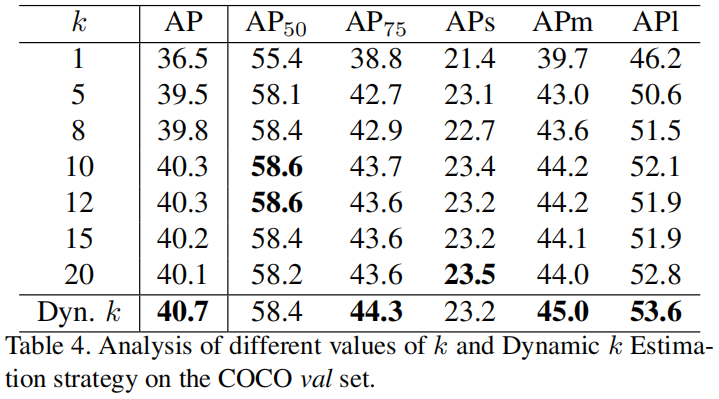 如下表所示,作者对比了 \(k\) 设置为不同的常数值以及采用dynamic \(k\) 时模型的精度,可以看出随着 \(k\) 的增大,模型精度越来越高,当 \(k\) 取10或12时,模型达到最高的精度,随后开始下降。但最高的精度也比采用dynamic \(k\) 的精度低。从直觉上讲,每个gt的大小、尺度、遮挡情况都不同,因此每个gt所需的postive anchor的数量应该也是不同的。