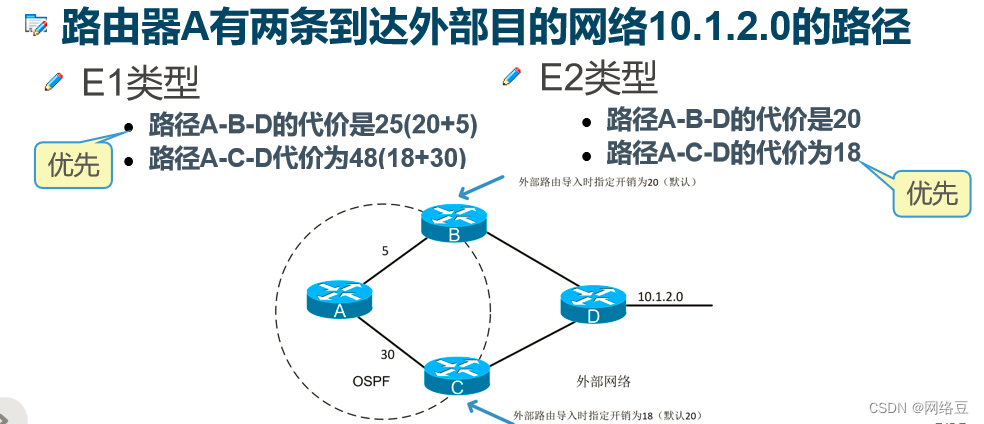 类型1的外部路径(Type 1 external path,E1):是指目的地在OSPF AS外部的路径,表示为E1