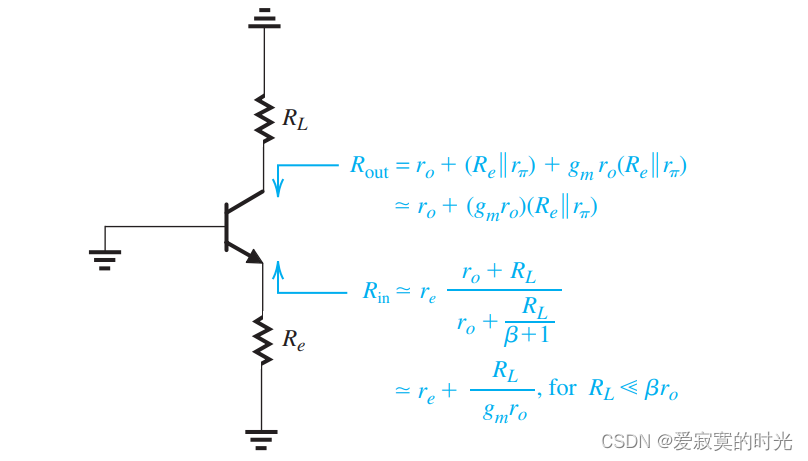 R o u t = r o + ( R e ∣ ∣ r π ) + ( R e ∣ ∣ r π ) g m r o = r o + ( 1 + g m r o ) ( R e ∣ ∣ r π ) R_{out} = r_o + (R_e || r_\pi) + (R_e || r_\pi) g_m r_o = r_o + (1+g_mr_o)(R_e || r_\pi) Rout=ro+(Re∣∣rπ)+(Re∣∣rπ)gmro=ro+(1+gmro)(Re∣∣rπ)