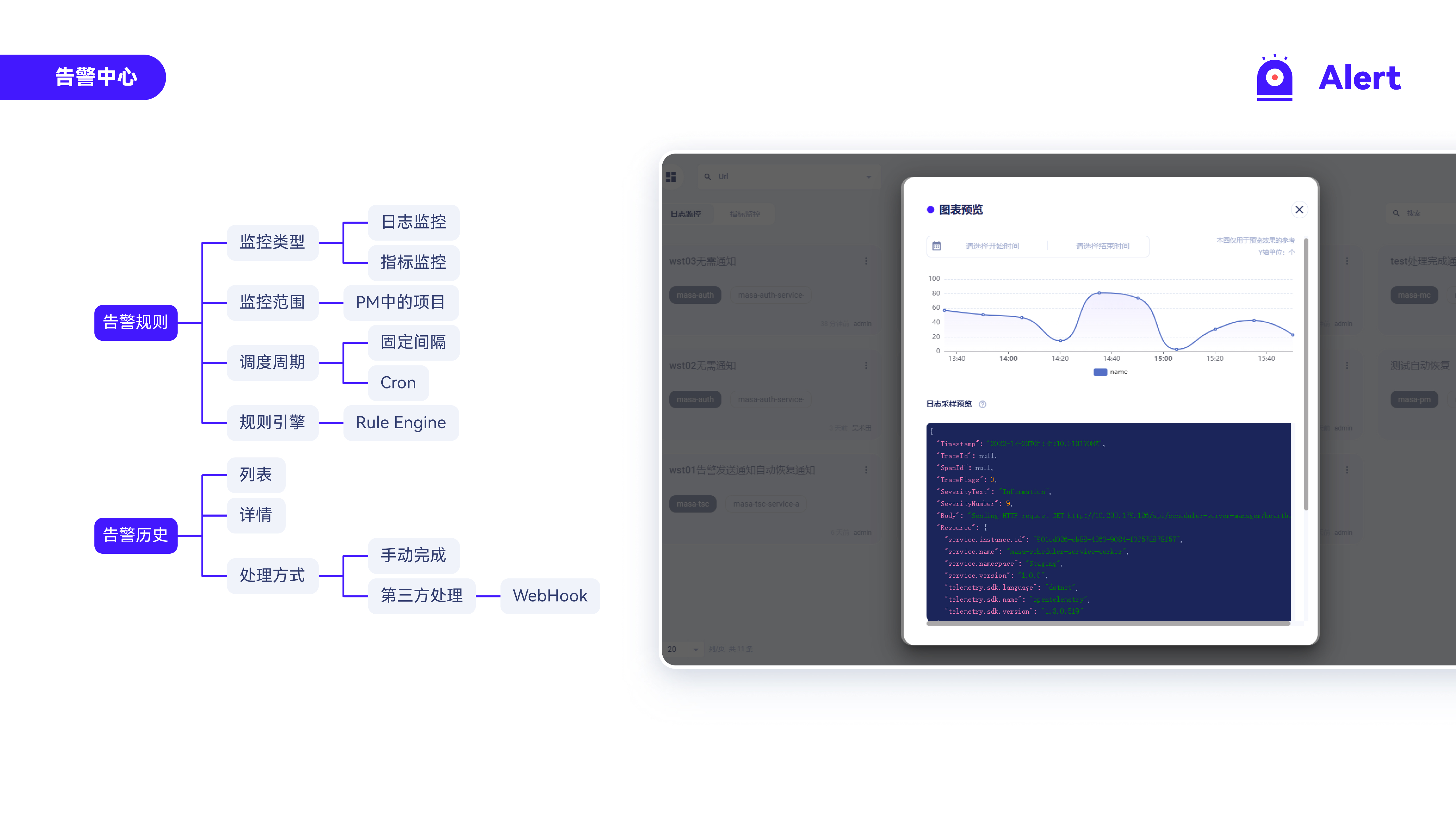 MASA Alert是一款配合性产品,主要提供告警规则以及制定相关指标。它需要借助几个产品的基础功能组合来发挥它的价值,比如故障排查控制台作为监测数据源,调度中心作为调度周期控制,消息中心作为发送消息的渠道。MASA Stack会尽可能的复用基础功能,而不是重复性工作,所以单一部署它将失去意义,产品结合可以发挥告警中心的最大价值。