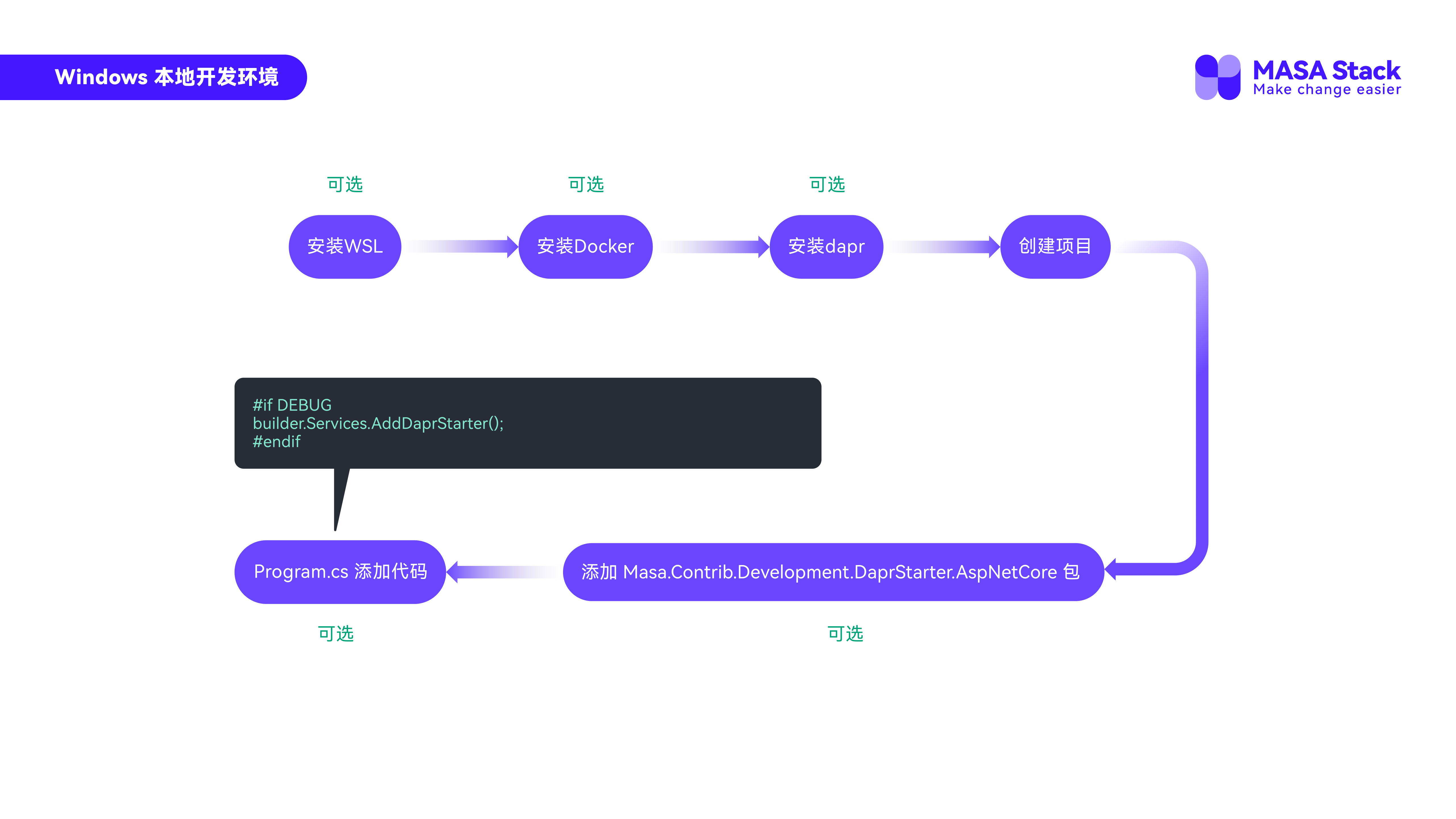 接下来是基于MASA Framework的开发,首先在我们的Windows本地开发环境里面,绝大数步骤都是可选的,但如果你用的是Dapr,还是希望可以选择完整的流程去开发项目