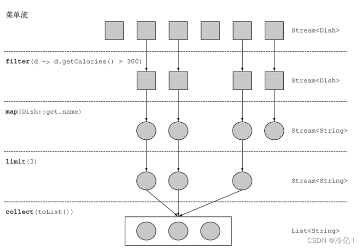 menu.stream() .filter(d -> d.getCalories() > 300) .map(Dish::getName) .limit(3) .collect(Collectors.toList())