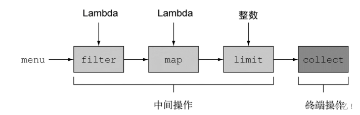 a. 一个数据源(如集合)来执行一个查询 b. 一个中间操作链,形成一条流的流水线 c. 一个终端操作,执行流水线,并能生成结果