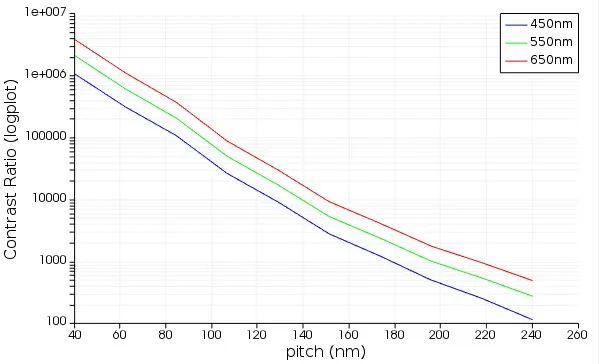 本分析将计算厚度H=140nm的50%占空比光栅和正入射光的对比度与间距的关系,光栅常数将在40nm和240nm之间变化(对应于W=20nm到W=120nm的线宽变化),将绘制3个不同波长(λ=450nm、λ=550nm和λ=650nm)的结果。通过对具有几个不同周期的光栅的透射对比度进行仿真,获得的结果与参考文献获得的结果一致。
