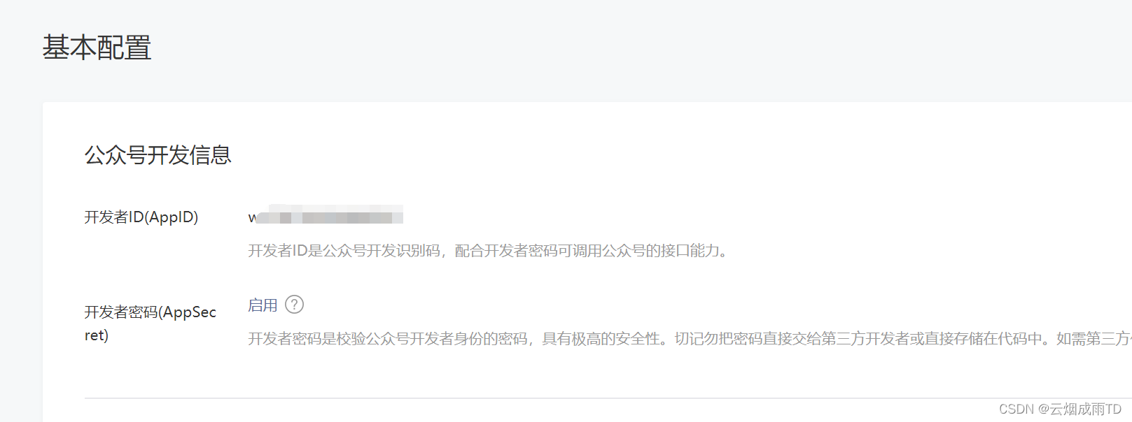 公众号申请成功后,服务商可登录公众平台即可获取对应的APPID,具体查阅目录为 【开发-> 基本配置-> 公众号开发信息】,如下图所示。