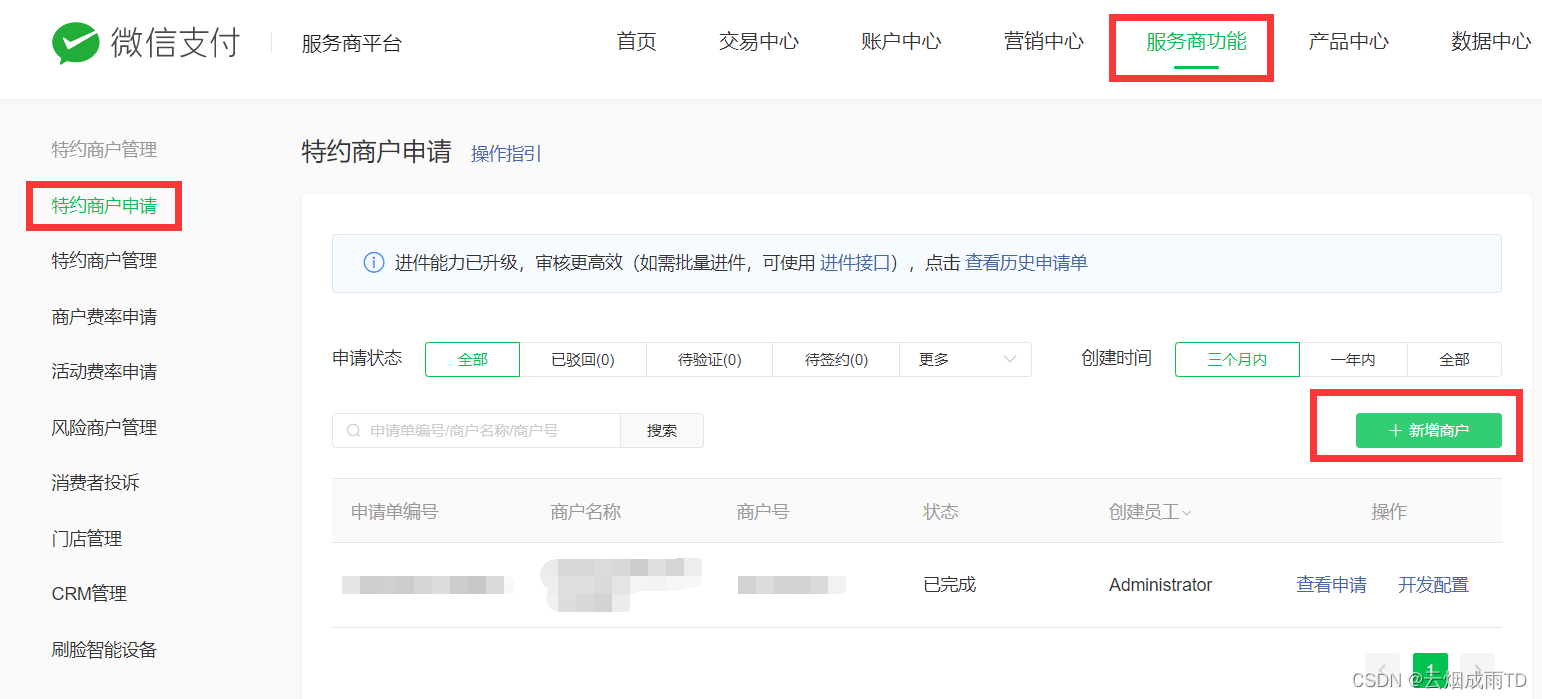 申请完成后,可以查看到微信支付下发的特约商户号。或者登录服务商平台新增商户按钮下的列表查看。