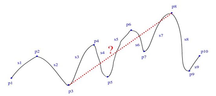 要求这条直线的长度。直接求不是很好求。所以呢,我们需要用别的求法。相信大家都知道勾股定理吧。a²+b²=c²。我们可以利用这条关系来解决这道奇妙的问题。首先,我们知道了很多上坡路和下坡路和平路的距离这个距离我们把它看作三角形的斜边。我们来构造这样一个三角形。注意:这个三角形是一个直角三角形。再沿着斜边靠上一点的那一个点往下做一条高直到这条高的下面的那个点的高度等于较矮点的高度时停止。在下哦那个较矮点到高的较矮点链接一条线段。这样就组成了一个直角三角形。因为我们知道斜和一条直角边的长度,我们叫可以用勾股定理来求另一条直角边的长度(即底边)。在从最小高度到最大高度的两点之间,所有三角形底边的和就是一条直角边,两点的高度只差就是另一条直角边。在用一次勾股定理求出斜边即可。
