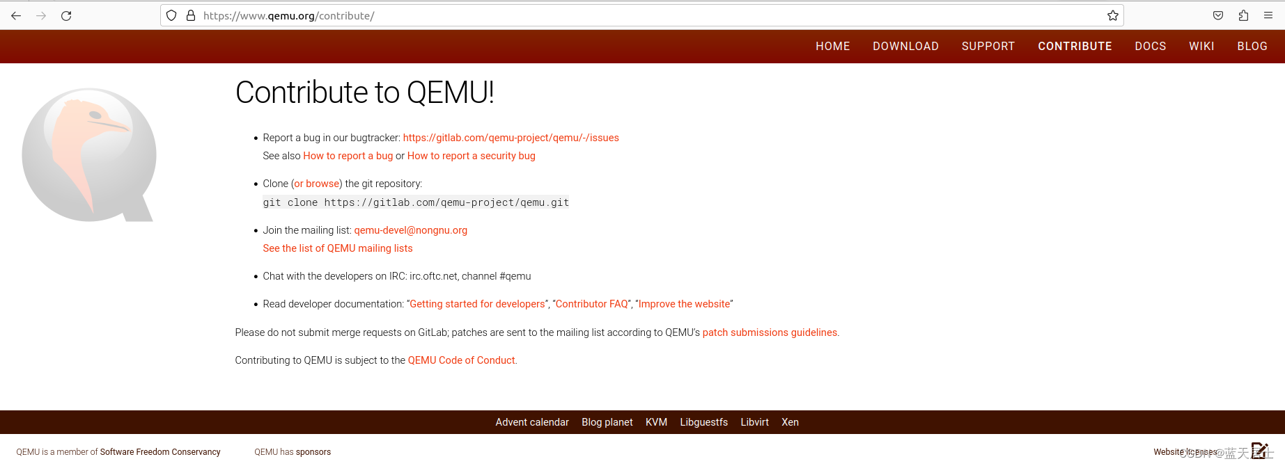 点击QEMU官网主页右上角的“CONTRIBUTE”按钮,跳转至CONTRIBUTE页面。如下图所示: