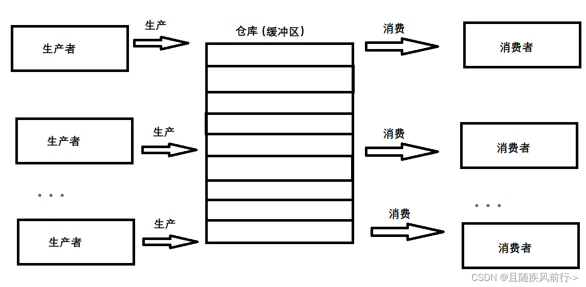 这个模型下有一个交易场所(缓冲区),两种角色(生产者和消费者),三种关系。(简记321原则)