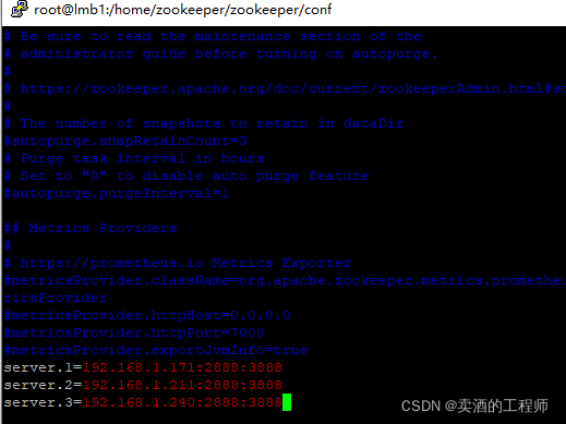 server.1=IP或者主机名:2888:3888server.2=IP或者主机名:2888:3888server.3=IP或者主机名:2888:3888