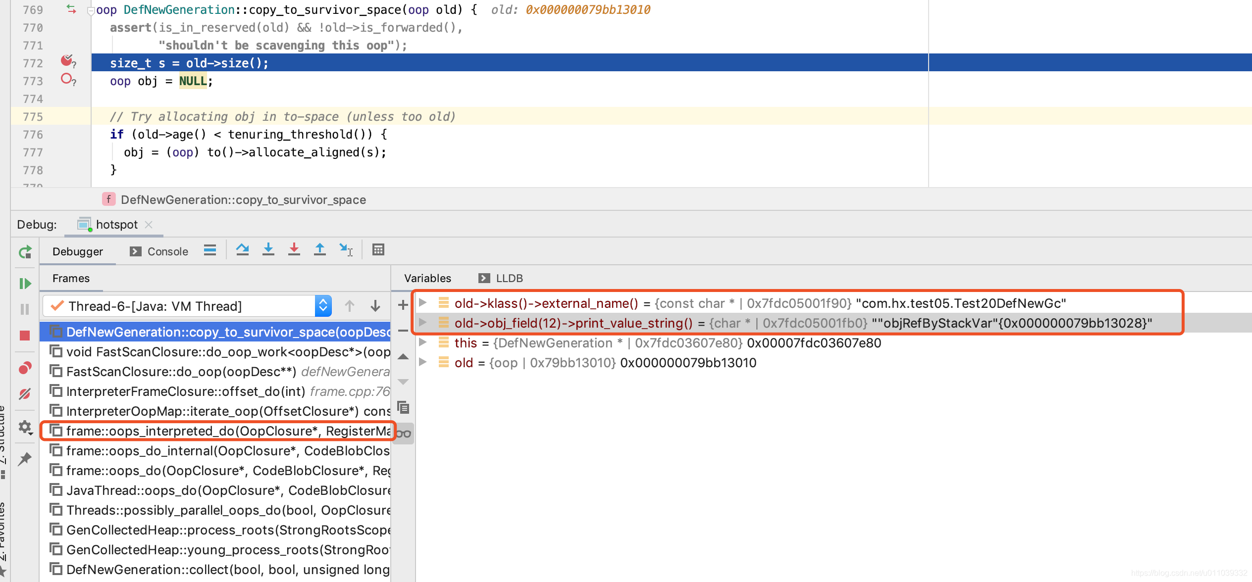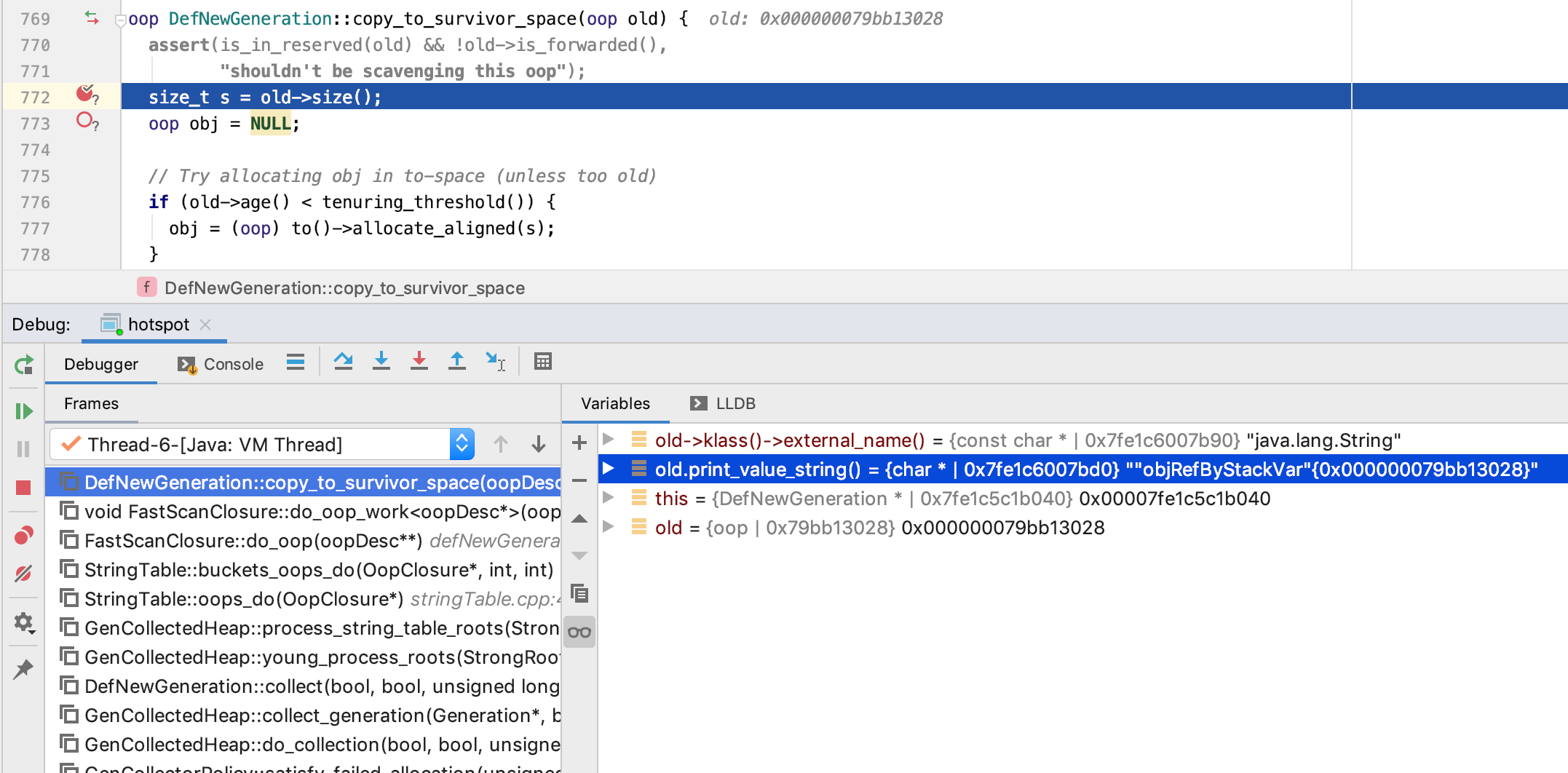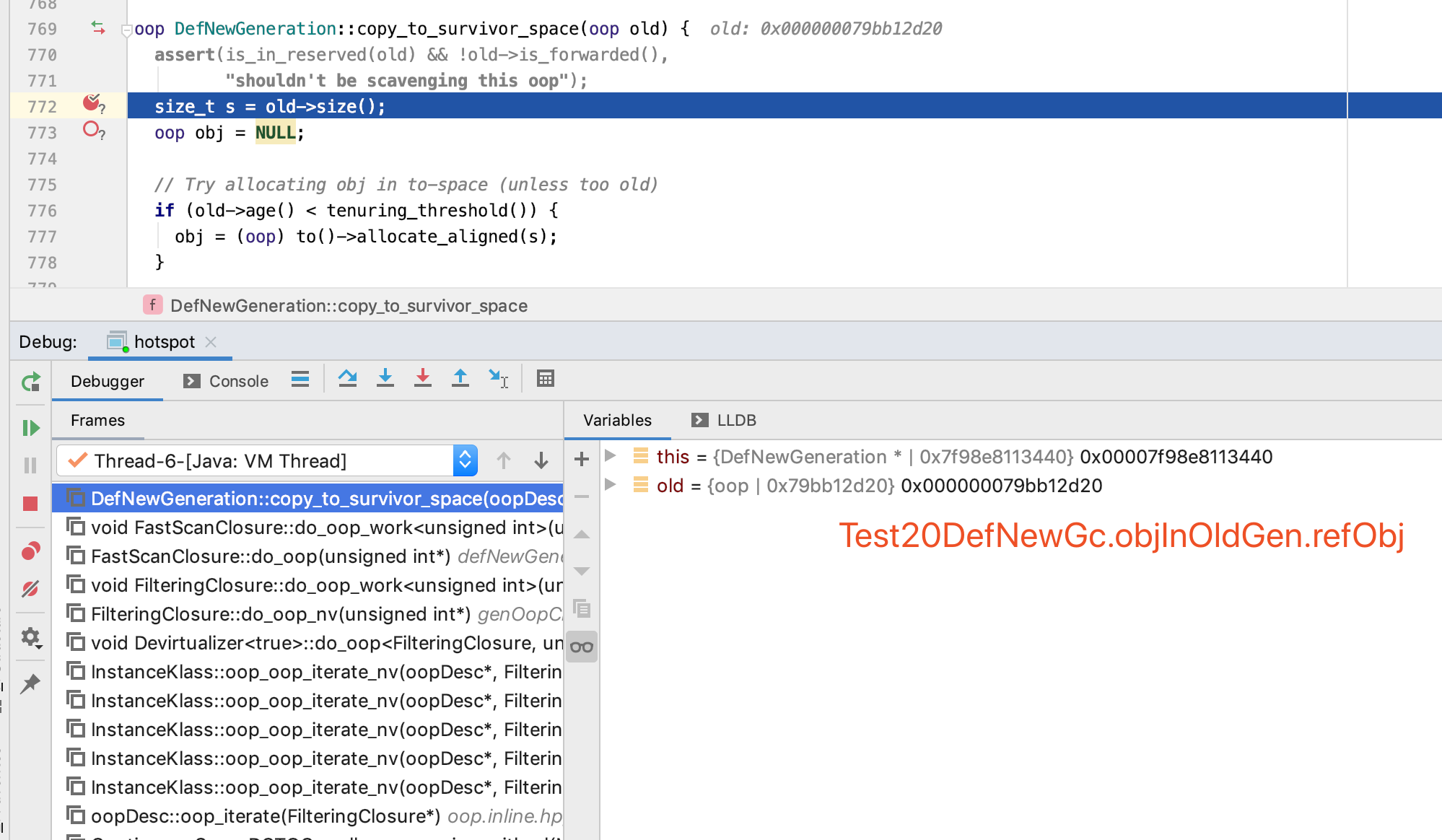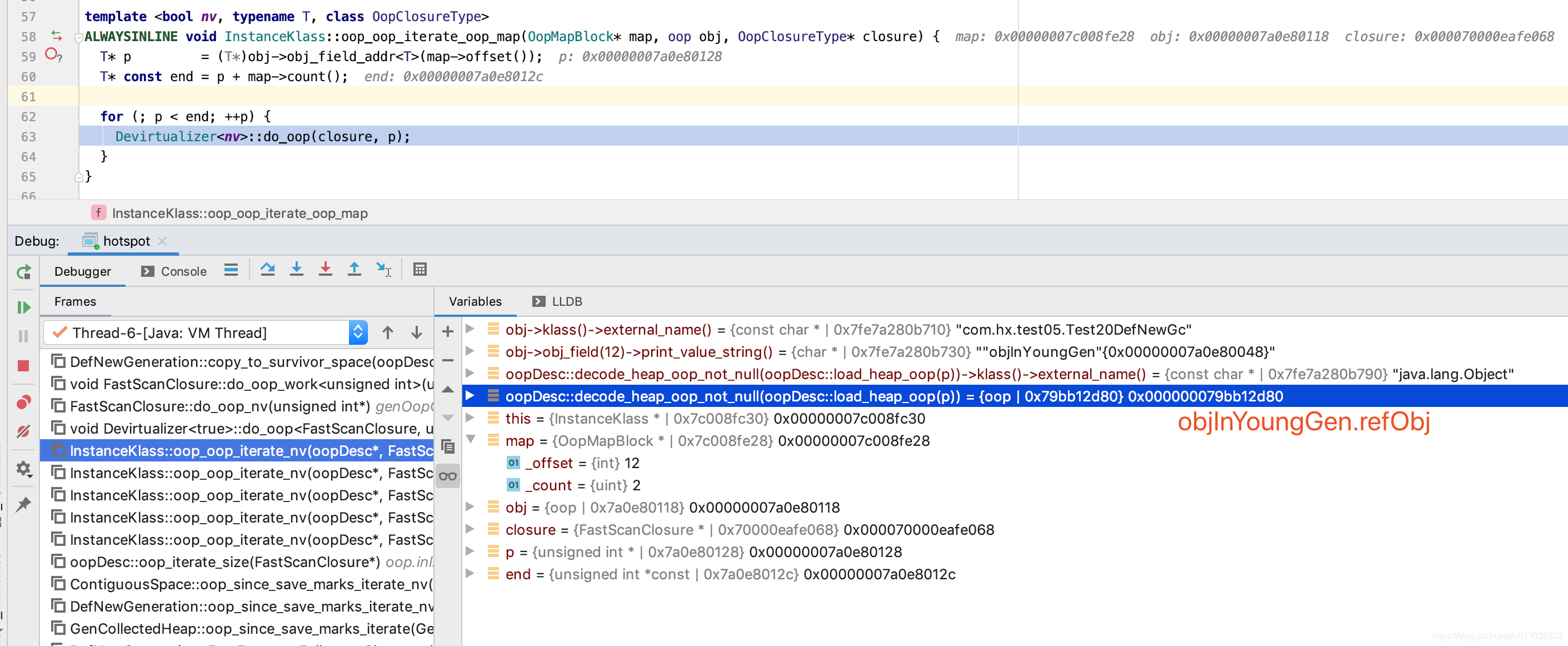 接下来 我们便来 调试一下 各个对象 在这次 minor gc 中的一些细节吧
