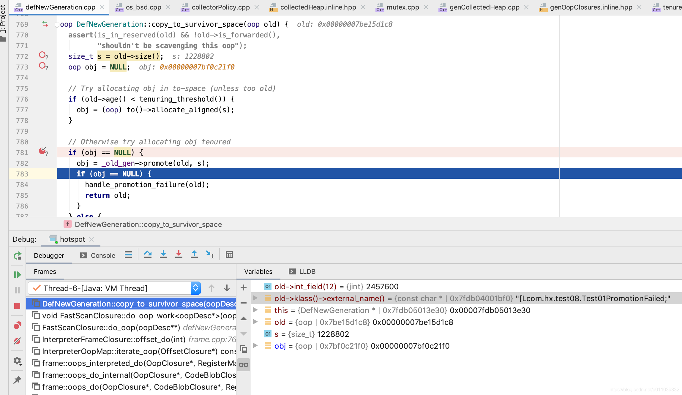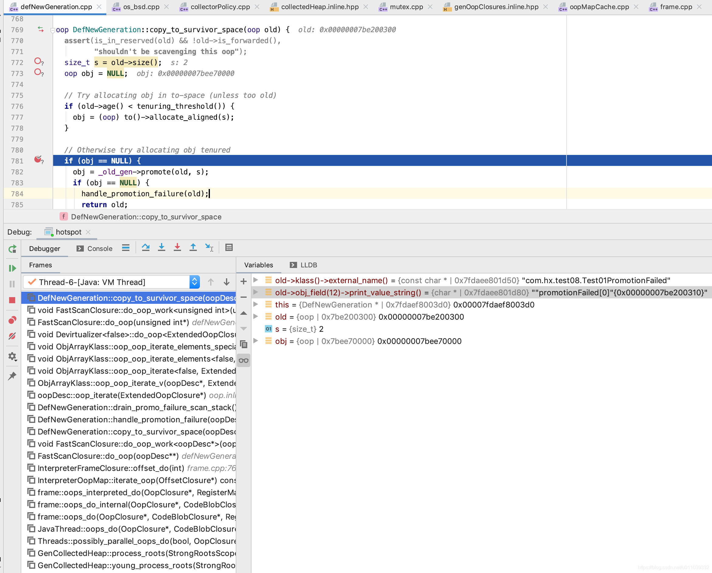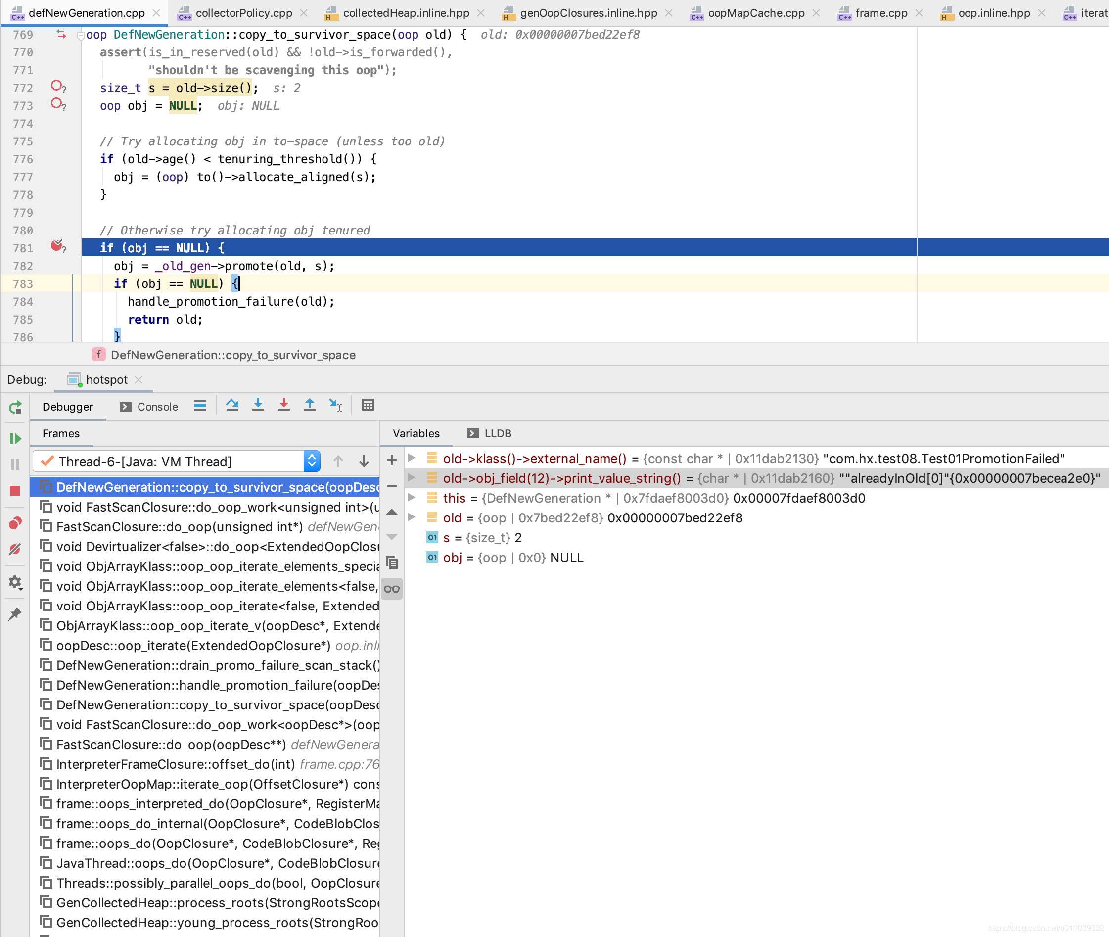 我们这里主要关注几个东西, alreadyInOld[0], promotionFailed, promotionFailed[0] 这三个引用对应的 oop, 以及这三个引用本身