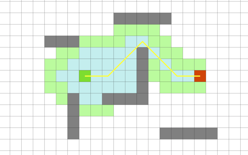 我们首先用A*算法看看规划的路径,其中绿色是开节点表中的节点,蓝色是闭节点表中的节点,黄色是规划路径