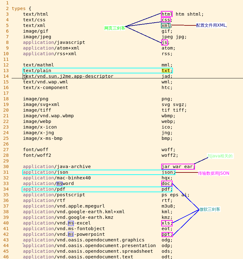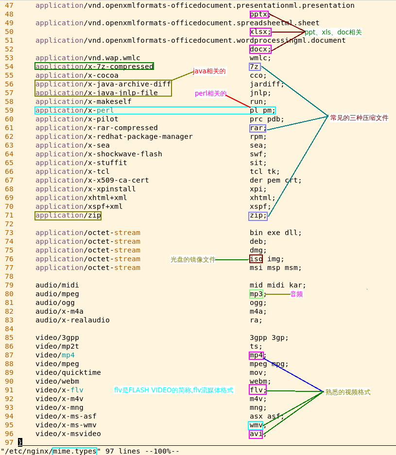 vim /etc/nginx/mime.types 说明: 最好不要'一种后缀文件'对应'多种媒体类型' 注意: 修改之后一定要'restart','reload'不生效 备注: 可以'写在同一行',以'空格隔开';也可以'另起一行' 细节: 这个方法修改后'影响所有nginx网站'的配置