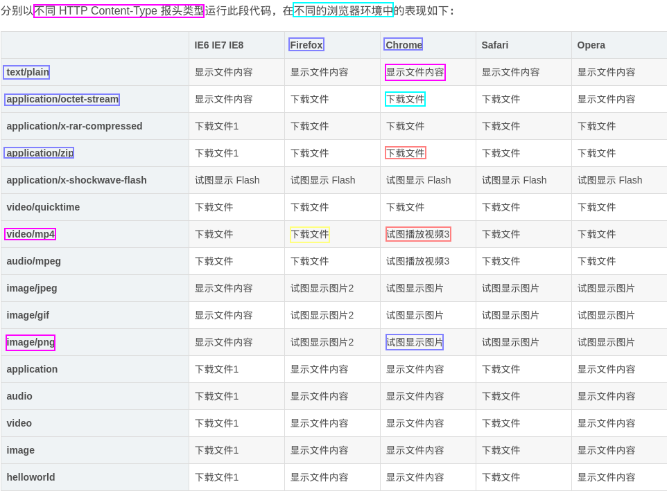 浏览器的'原则'是能'打开'就打开-->'在自己的媒体类型中',不能打开'就下载' 1)每个'浏览器内置支持'的 Content-Type 类型表各不相同,这导致了'某些类型字符串'在'某些浏览器下'不被识别 2)另外如果'出现错误'的 Content-Type 类型,各个浏览器又会'以不同的方式'处理