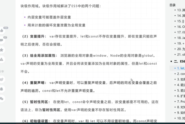 1.let:块级作用域(作用是可以防止内部变量被外部的覆盖;防止记录循环的局部变量泄露为全局变量) 不存在变量提升 不可以重复声明 暂时性死区