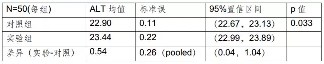 有个药物,判断服用药物是否会造成ALT水平变化。50位患者随机分配到实验组,另外50位患者接受安慰剂(对照组)。试验结束后,获得数据如下: