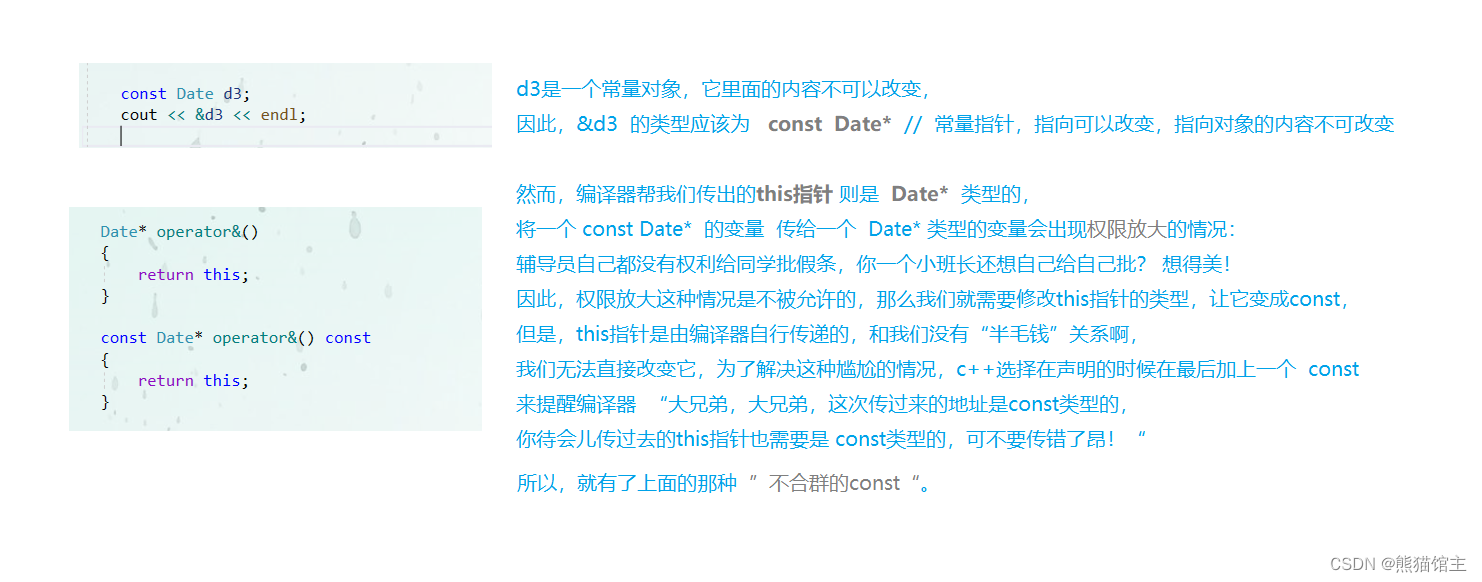 上面我们看到,输出d1和d2的地址的时候使用的是普通对象取地址,但是输出d3的地址的时候需要使用const对象取地址,不就是取个地址嘛为什么还要分是不是const对象,而且,const取地址重载里有一个 const 看起来好像有些 “不合群” 呐,孤零零在外面。