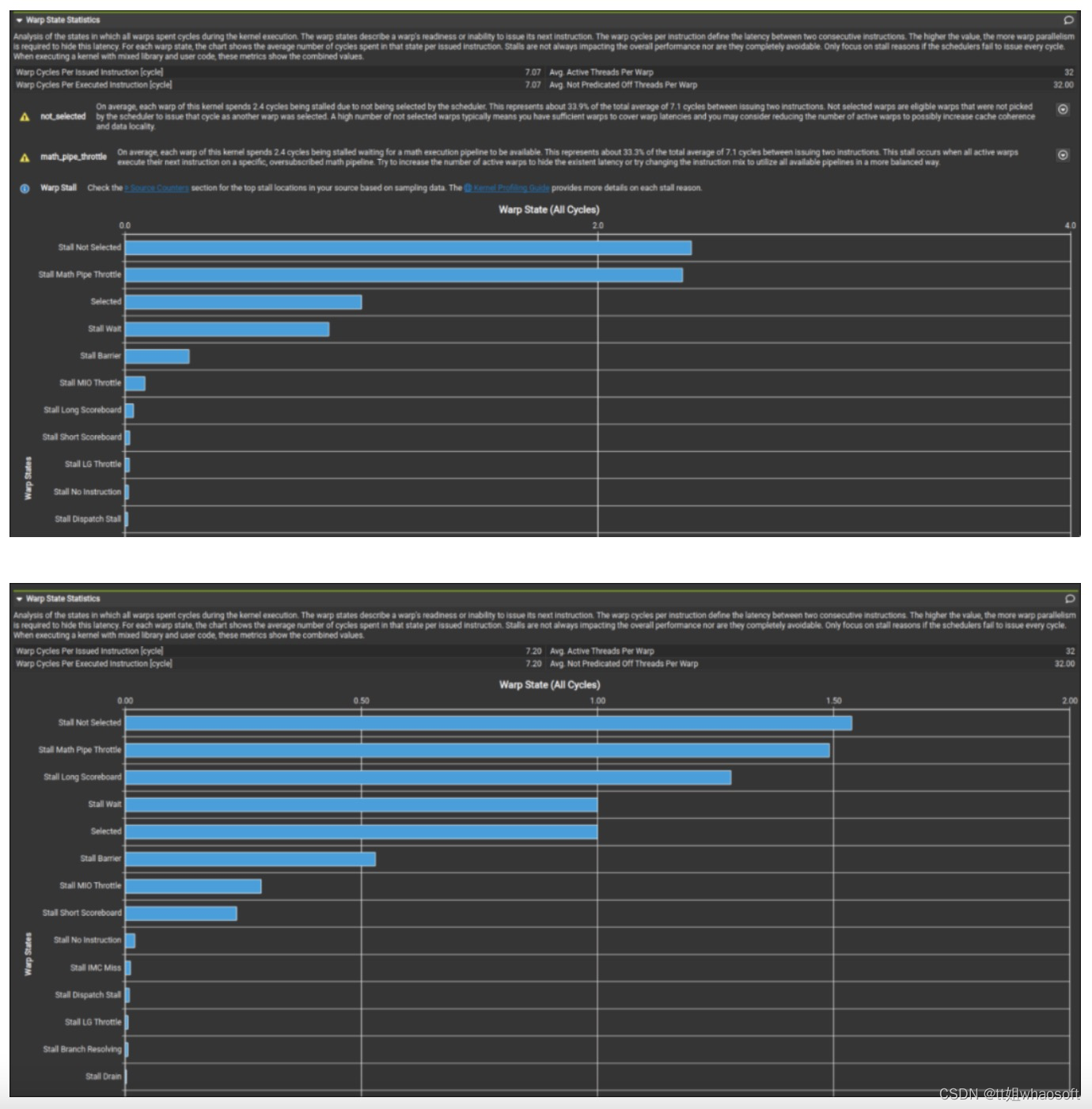 而我们这里对比李少侠的 kernel profile 和我们最终的成品发现,在 global memory 读取处是否使用向量化读取其实并不会对性能有多少影响。可以看到最终 profile 出来的 Stall LG Throttle 和 Stall MIO Throttle 占比都不高。