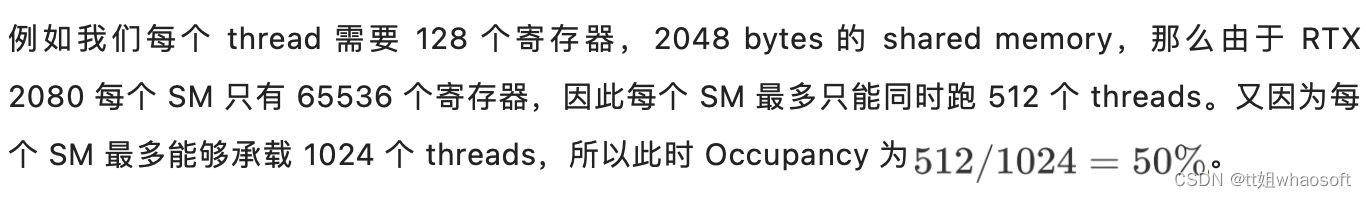 值得一提的是,虽然较高的 Occupancy 使得在一个线程卡住时,SM 能够马上切换到别的线程,通过将其他线程需要执行的指令填充到流水线中从而达到覆盖延迟的目的,但这并不代表高性能。例如,如果每一个线程本身就能够通过更多的寄存器占用从而达到延迟覆盖的目的,自然也就不需要 SM 来做这件事了,反倒是如果无脑的去提高 Occupancy 使得一些 thread 内的延迟甚至都无法被 SM 通过切换执行线程的方式覆盖,那属实是得不偿失了。
