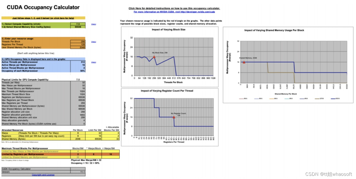 而 Occupancy 也是和硬件强相关的。一个 GPU 由多个 SM 构成,每一个 SM 拥有有限的寄存器数量、 shared memory 和最大可调度线程数量。而 Occupancy 是指每个 SM 能够同时调度的线程数量除以一个 SM 的最大可调度线程数量。关于 Occupancy 的计算我们可以通过在编译时添加 --ptxas-options=-v 参数,使编译器在编译时输出每个 kernel 所花费的寄存器数量和 shared memory,然后通过随 cuda 提供的一个 excel 表格进行计算。(尽管这个 Excel 已经 deprecated 了,但他用起来确实挺方便的。)