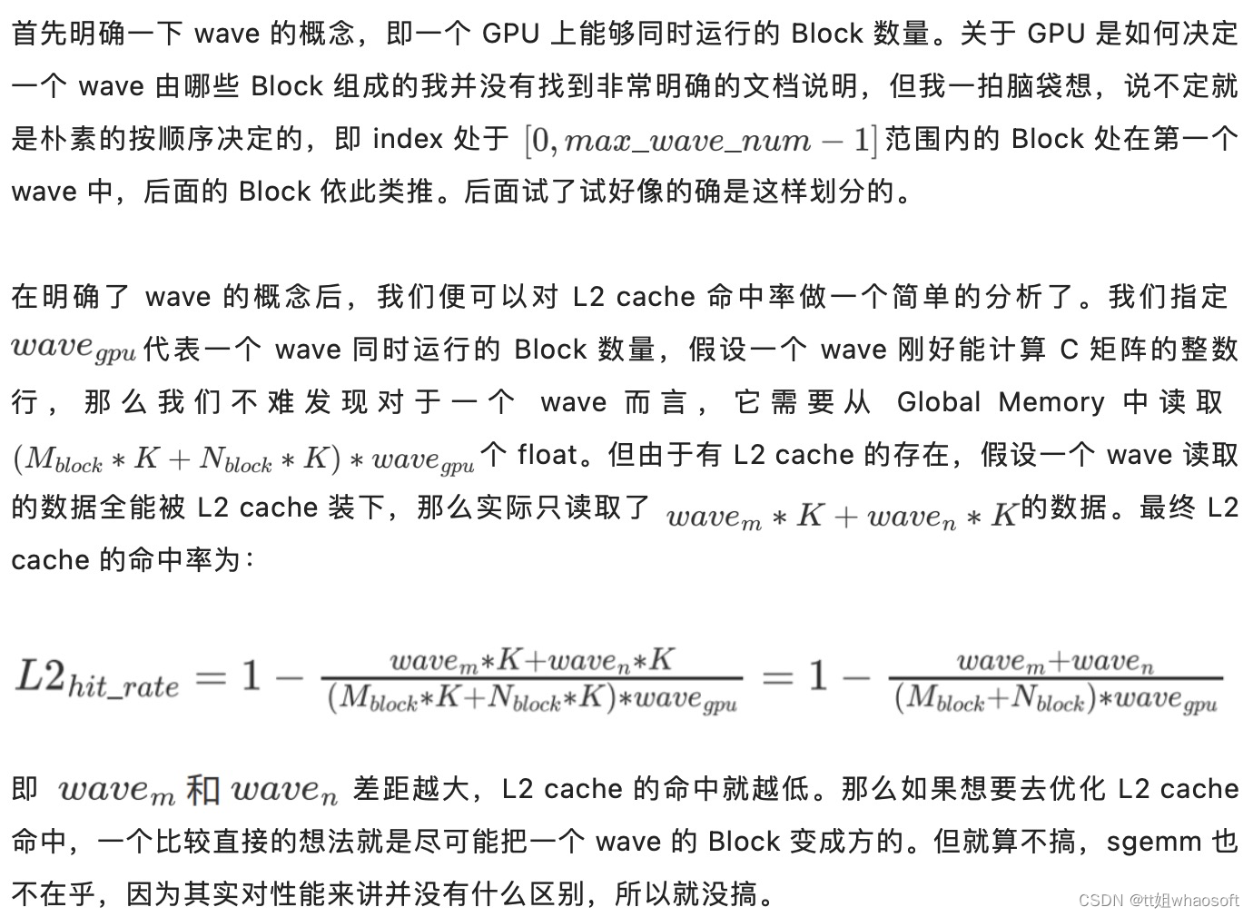Block 在 GPU 上基本等同于不同的 kernel 在 GPU 上运行了,所以它们之间的联系并不是特别强烈。而它们之间的相互关系在 GEMM 语境下基本就只有 wave 和 L2 cache(一个 wave 里的 Block 共享这一块 cache)了,良好的 Block Tiling 能提升相当可观的 L2 cache 命中率。