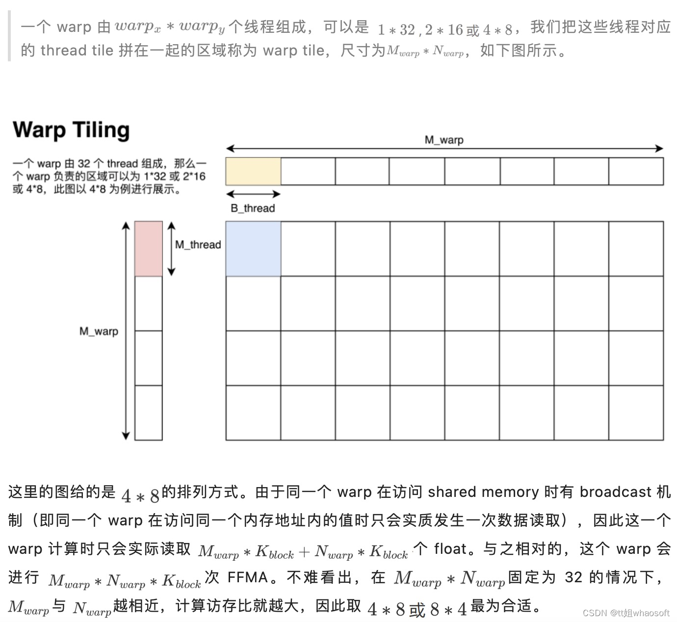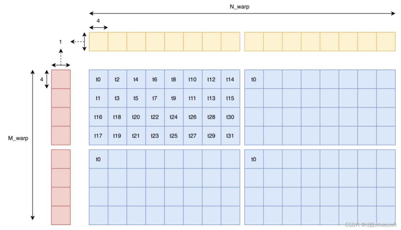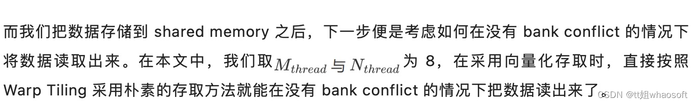 当 warp 中每个 thread 只读取 4B 或更小数据时,warp 才是同时读取的。而本文中采用 128-bit 也就是 16B 读取,那么一个 warp 会分成 4 次操作读取,每次操作只有 1/4 warp 工作。那么只要同一次操作内的 thread 没有发生 bank conflict,那么就没有 bank conflict。而上图中 t0-t7 同时操作,它们之间并没有 bank conflict,后面的 thread 依此类推,那么也就不会有 bank conflict。那么朴素的 warp tiling 实现代码在这:https://github.com/AyakaGEMM/Hands-on-GEMM/blob/main/src/cuda/warp_tile_gemm.cu
