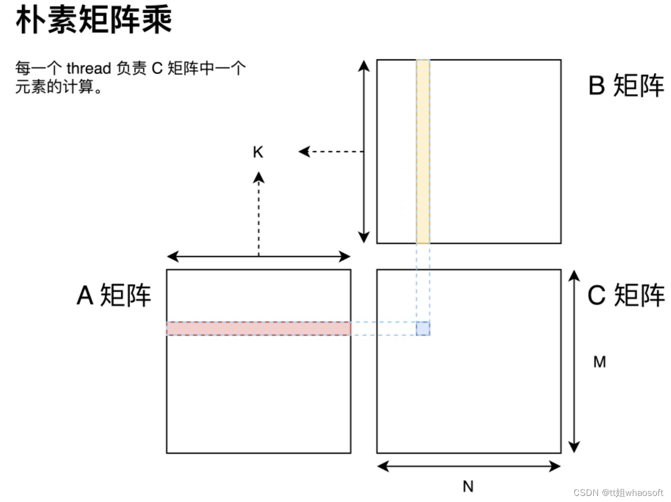 局部性原理,在我的理解中便是为了能够尽可能的使用高速缓存器内的数据进行运算所提出的一个程序设计理念。由于高速缓存器往往十分昂贵(或者需要很高的功耗),因此空间都不大。由此我们需要尽可能的将一些重复访存聚合起来,放到高速缓存器里面来加速数据访问,或者在进行访存的时候尽可能连续访存来使用 cache 加速访存。我们先还是让每一个 thread 负责一个目标矩阵元素的计算。虽然这种分配方式十分朴素、十分直接,同时各个 thread 之间也没有数据依赖关系,不需要做额外的同步之类的操作,但这种分配方式却是十分访存不友好的,因为每一个 thread 都是直接与内存做交互,而 GPU 的全局内存访问带宽完全不足以匹配上它的计算速度。