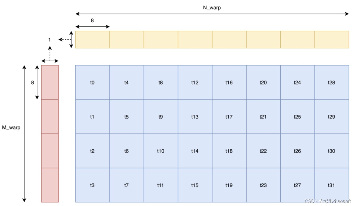 已知我们指定一个 Block 计算 128x128 的矩阵,一个 Block 有 8 个 warp,一个 warp 有 32 个 thread,每个 thread 需要负责 8x8 的小型矩阵乘,那么我们沿用李少侠的定义: