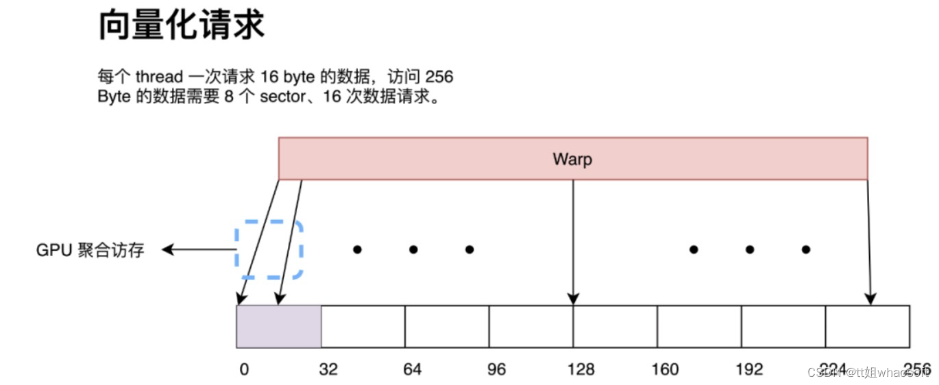 而如果每一个 thread 请求 8 Byte 数据,那么 GPU 会在硬件处同样将 32 次数据请求按照 32 Byte 进行合并,最终形成也形成 8 次 32 Byte 内存访问。