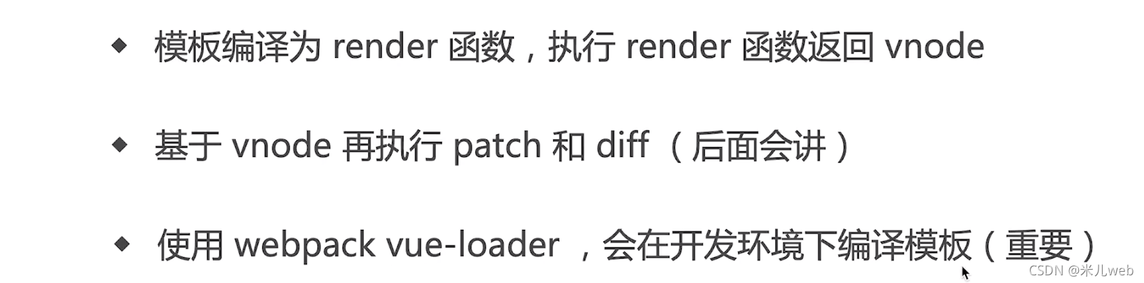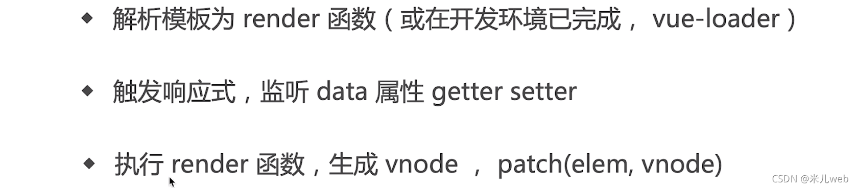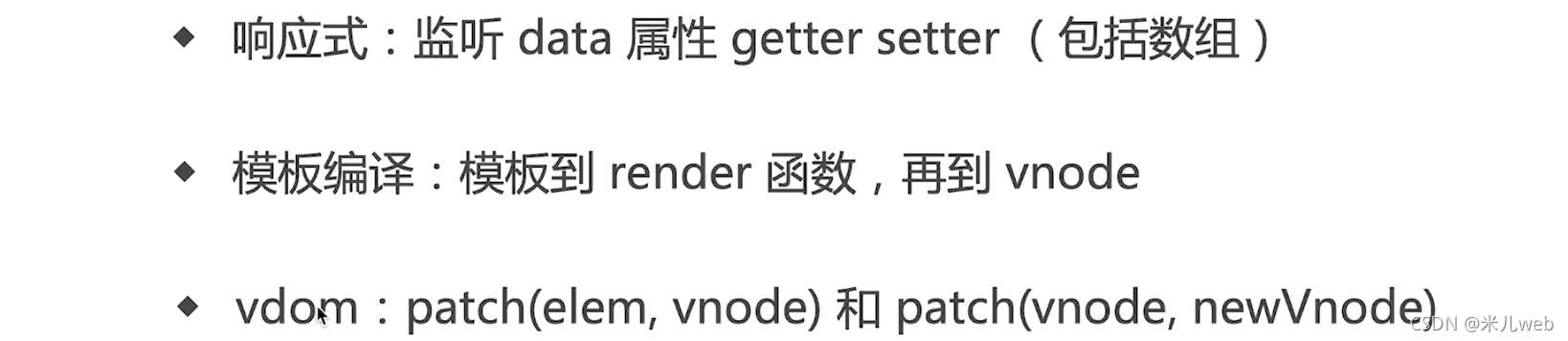 - Watcher : 观察者对象 , 实例分为渲染 watcher (render watcher),计算属性 watcher (computed watcher),侦听器 watcher(user watcher)三种