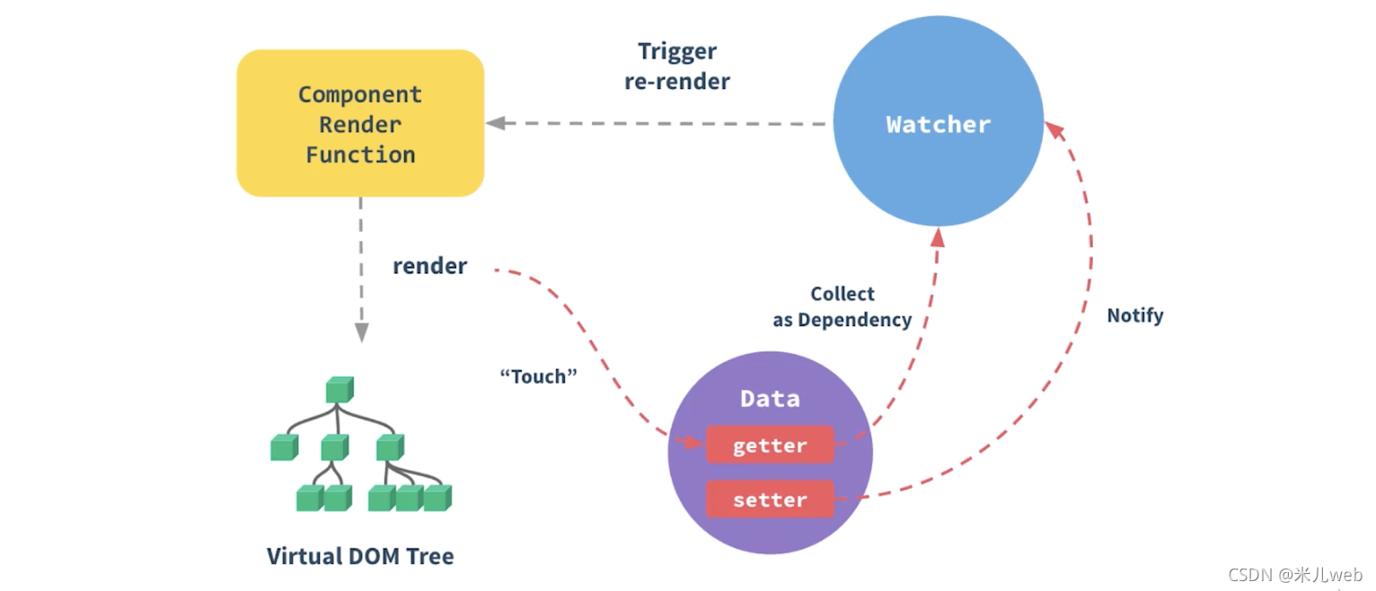 每个组件实例会有相应的 watcher 实例,会在组件渲染的过程中记录依赖的所有数据属性(进行依赖收集,还有 computed watcher,user watcher 实例),之后依赖项被改动时,setter 方法会通知依赖与此 data 的 watcher 实例重新计算(派发更新),从而使它关联的组件重新渲染。