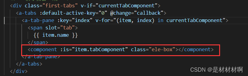 就比如我有10几个tab,每个tab中都有个组件,将需要循环展示的组件放入currentTabComponent(自定义)中,通过v-for实现