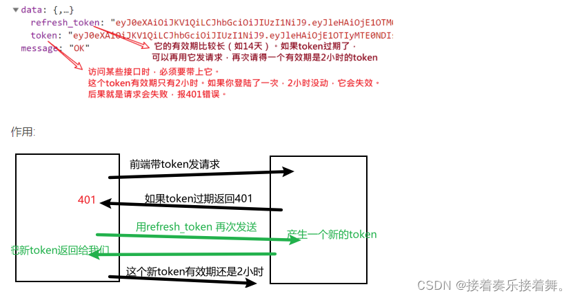 前端请求接口api --> 返回401错误 --> 前端判断是否有refresh_token -->如果有就用refresh_token请求新的token --> 后台成功返回一个新的token给我们 --> 更新vuex+本地存储持久化 --> 然后重新发送请求 --> 带上新的token请求数据